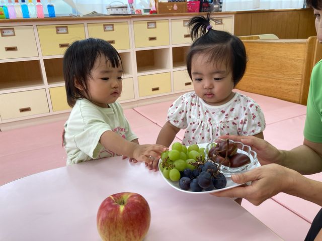 秋の果物に触れて感触を楽しみました。鼻を近づけて嗅いでみる姿も見られました。大きい梨やりんごを持ち上げようとしていました。何度も挑戦し持てると嬉しそうでした。