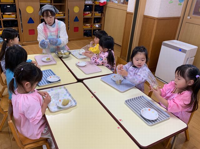 保育園で育てたさつまいもを作っておやつを作りました。さつまいもをつぶしてお菓子などで飾りつけ。「みて。できた」と見せ合っていました。